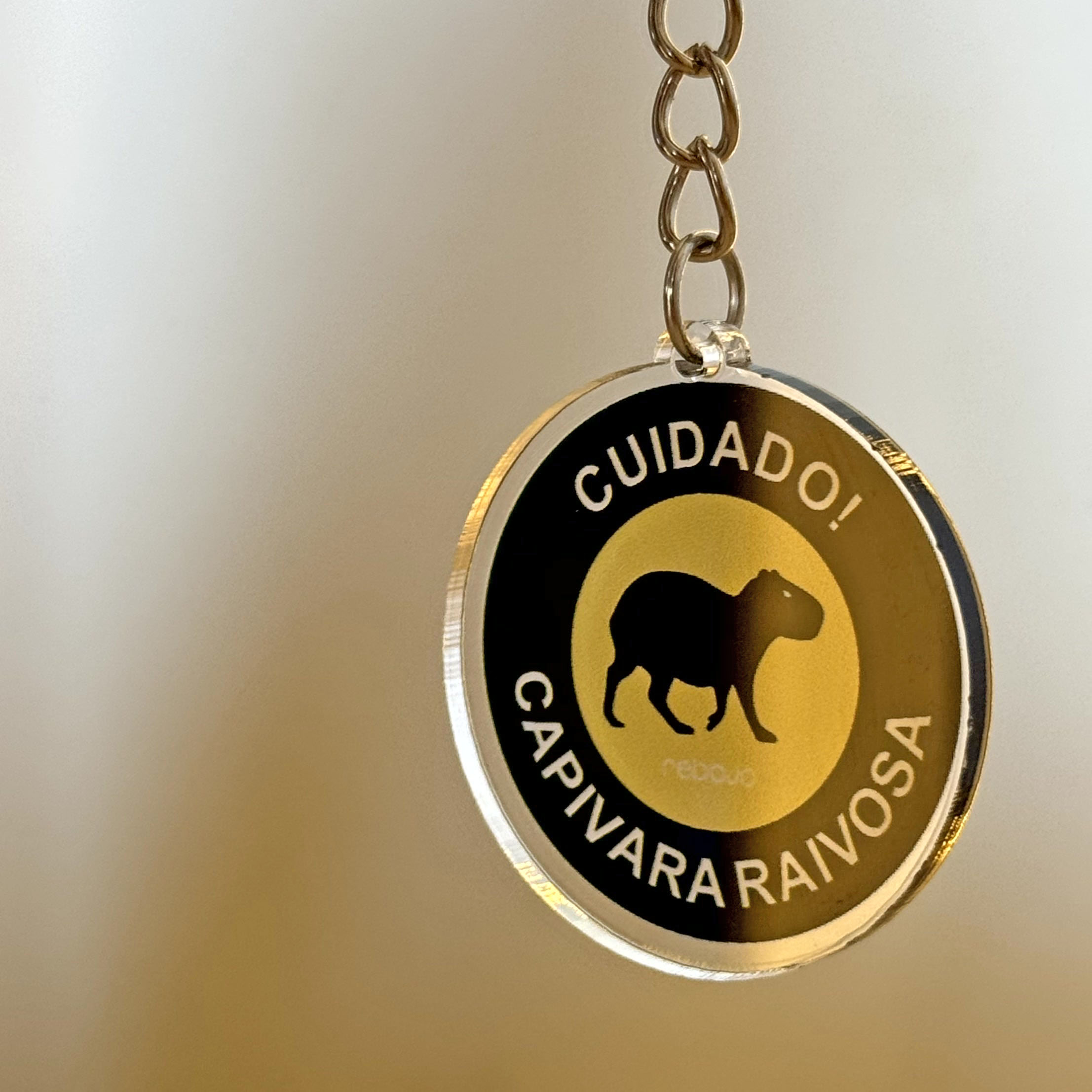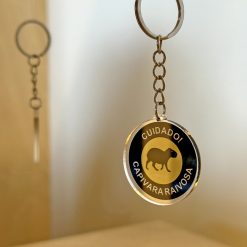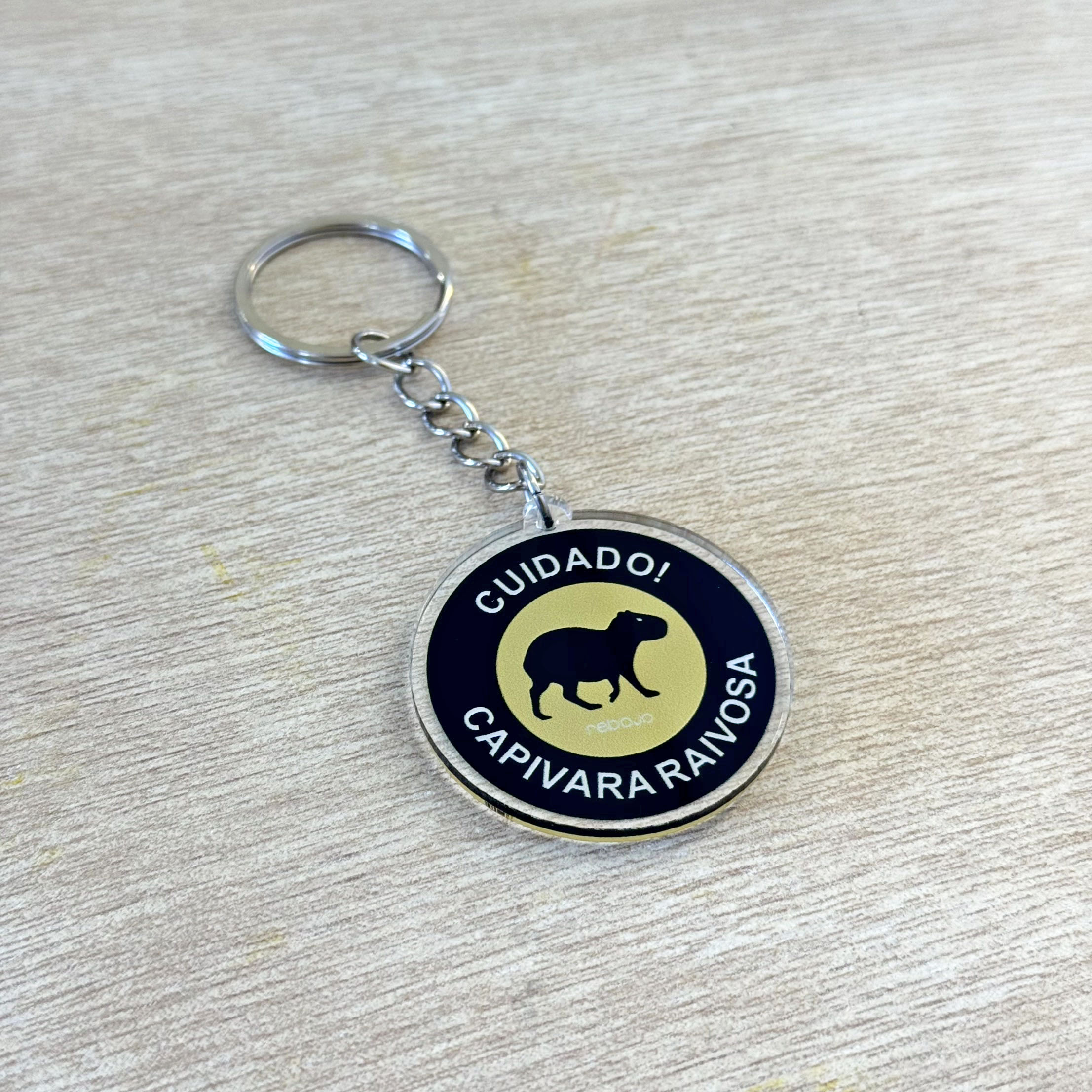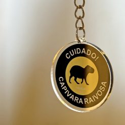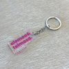 Chaveiro em acrílico com argola e correntinha em metal.