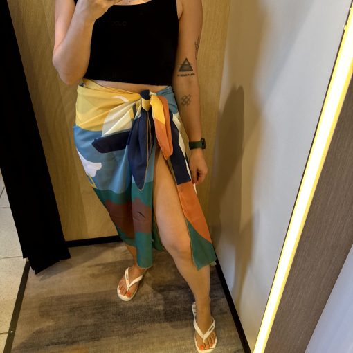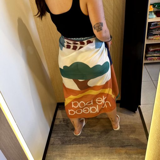 Pra usar a saia pareô da forma convencional não tem muito segredo: é só fazer uma amarração lateral ou frontal, mostrando o detalhe da fenda. O bacana é que esse modelo de saia vai da praia à noite, tudo dependendo da combinação de roupa. Mas fica perfeita mesmo é como saída de praia com maiô ou biquini.